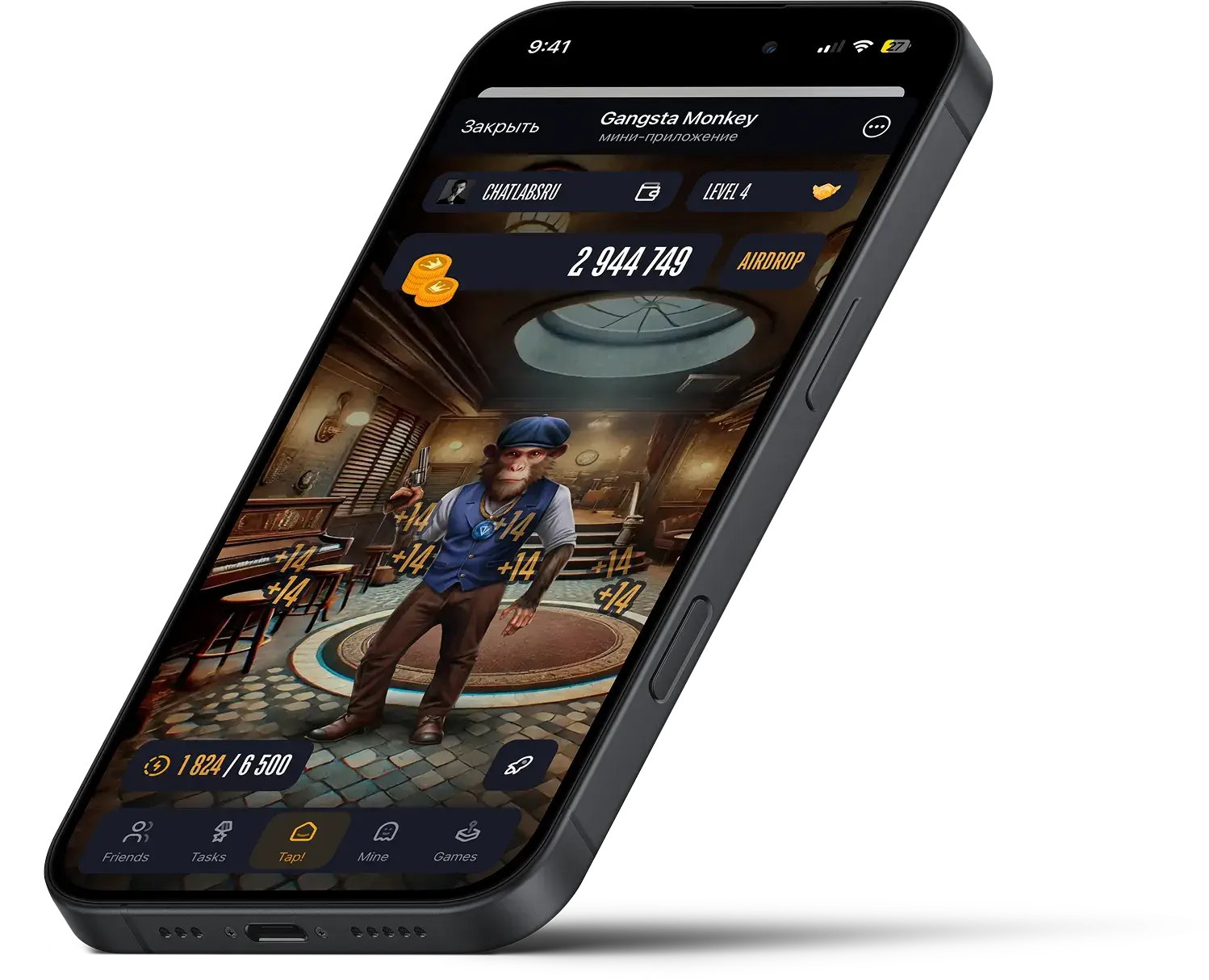 Play-to-Earn механика в стиле мафии 1920−30-х: тапание, коины, бустеры, смена фонов и персонажей.